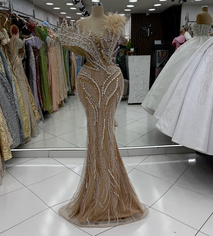 เดรส2025งานตามสั่งลายขนนกแชมเปญชุดราตรีประดับคริสตัลหรูหราเดรสงานหมั้นสำหรับงานเลี้ยงวันเกิด